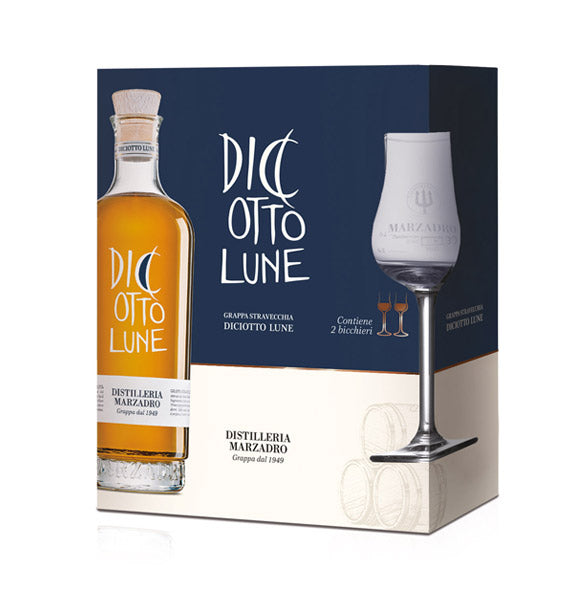 Geschenkset Marzadro Grappa Le Diciotto Lune 41% vol. 0,50l mit 2 Gläsern - Insieme Lune